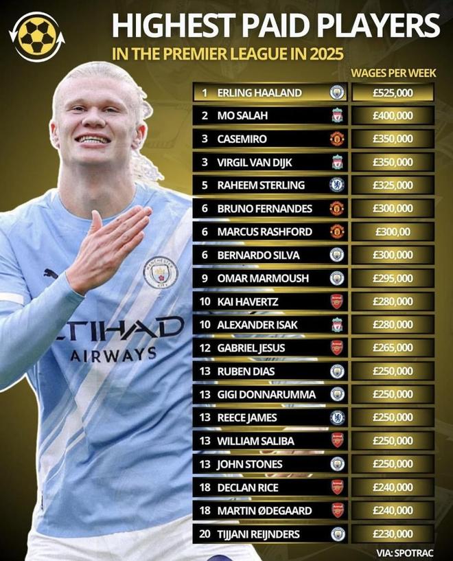 英超工资最高的前20人!曼城六名 阿森纳五名!哈兰德每周479万元